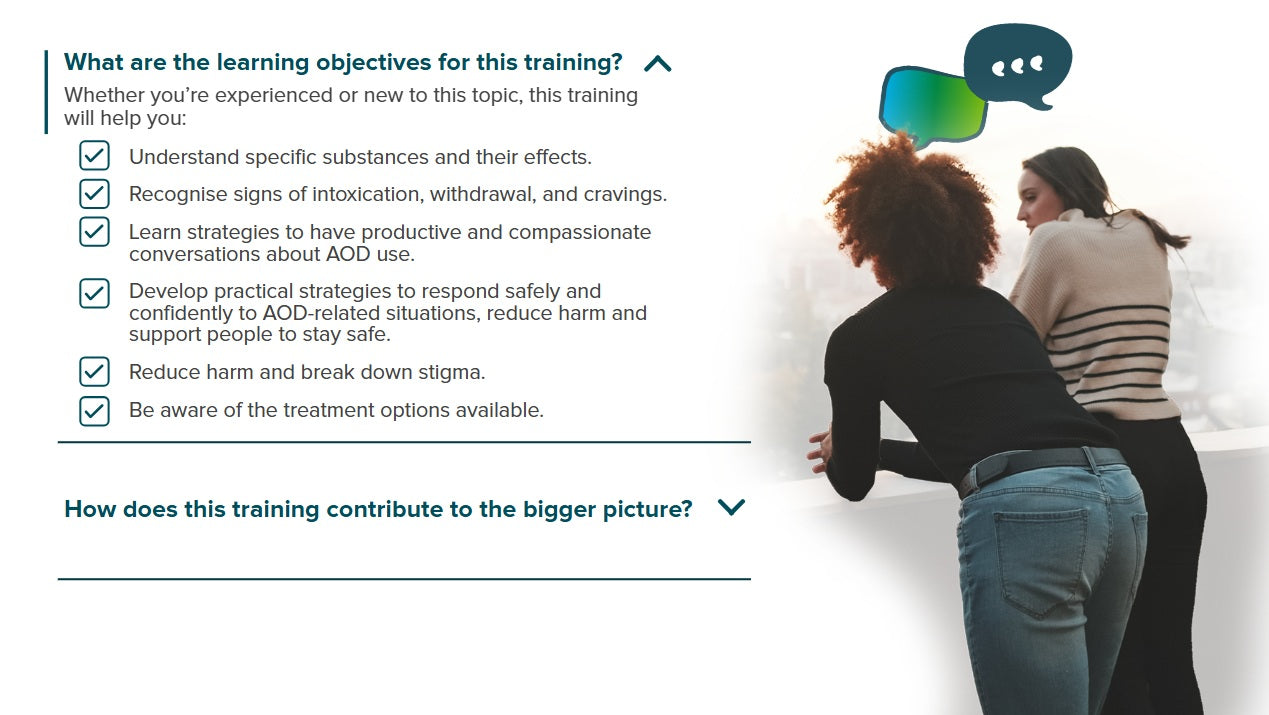 Note: This training includes images and descriptions of alcohol, other drugs, and related paraphernalia. Some material may be confronting or distressing, particularly for those with lived or living experience. If you find any content difficult, please pause, practice self-care, and reach out to support if needed.